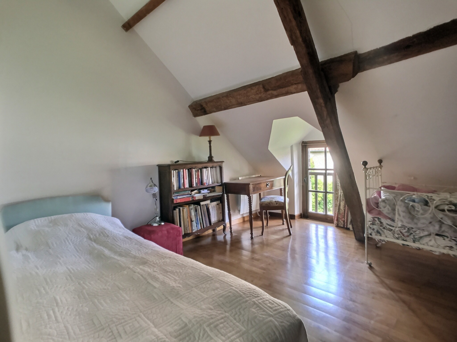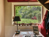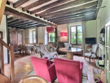 La maison principale, en retrait de la rue, s'ouvre sur une belle pièce de vie (45 m²) à la double exposition. Les poutres, les deux cheminées, les proportions contribuent à l'ambiance intime et chaleureuse. A l'étage, le palier distribue une salle d'eau et deux chambres.