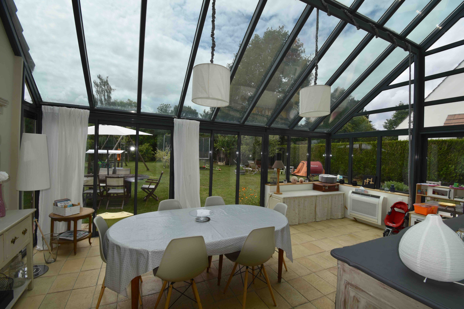 Proche du centre ville, cette maison contemporaine de 200 m² environ propose une entrée, un très bel espace de vie avec une véranda chauffée, un poele à bois, une cuisine indépendante, un cellier, un bureau, un toilette. A l'étage, deux chambres parentales avec salle de bains dont une avec un espace bureau, deux autres chambres (dont une avec mezzanine), une salle de douche, un toilette. Au deuxième étage, une belle chambre de 20 m². Garage. Terrain de 900 m², au calme, sans vis-à-vis.
