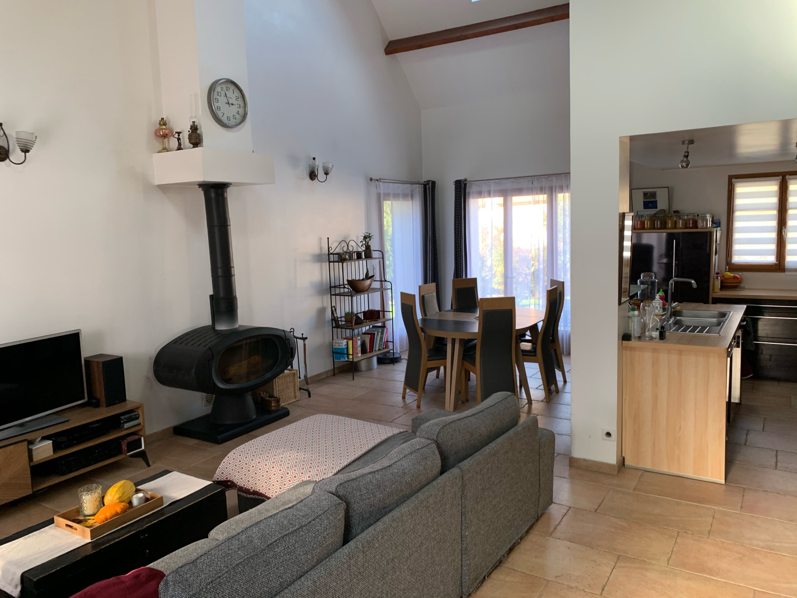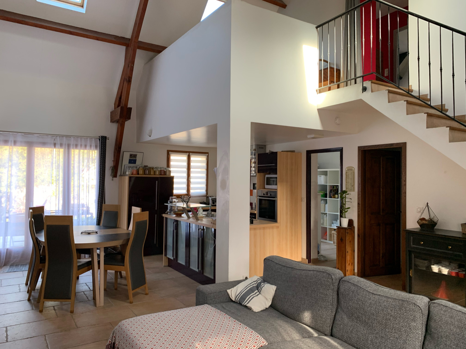 Au calme, cette maison récente de 2007 vous propose une pièce de vie cathédrale, avec poêle à bois, ouverte sur une cuisine moderne et équipée, une buanderie, deux chambres, une salle de douche et toilettes. A l'étage, bureau en mezzanine, deux chambres, un espace salle de jeux/lecture, une salle de bains et toilettes. Garage avec stockage en mezzanine. Grande terrasse. Terrain de 800 m² avec cour pavée et portail électrique.
