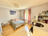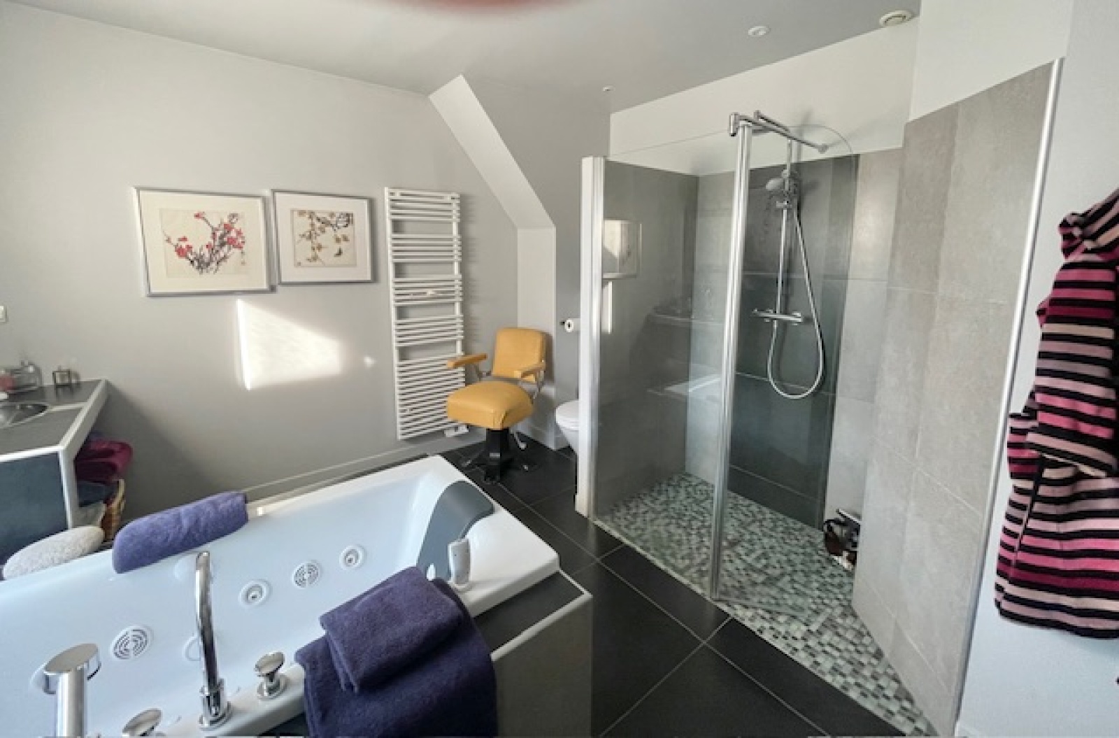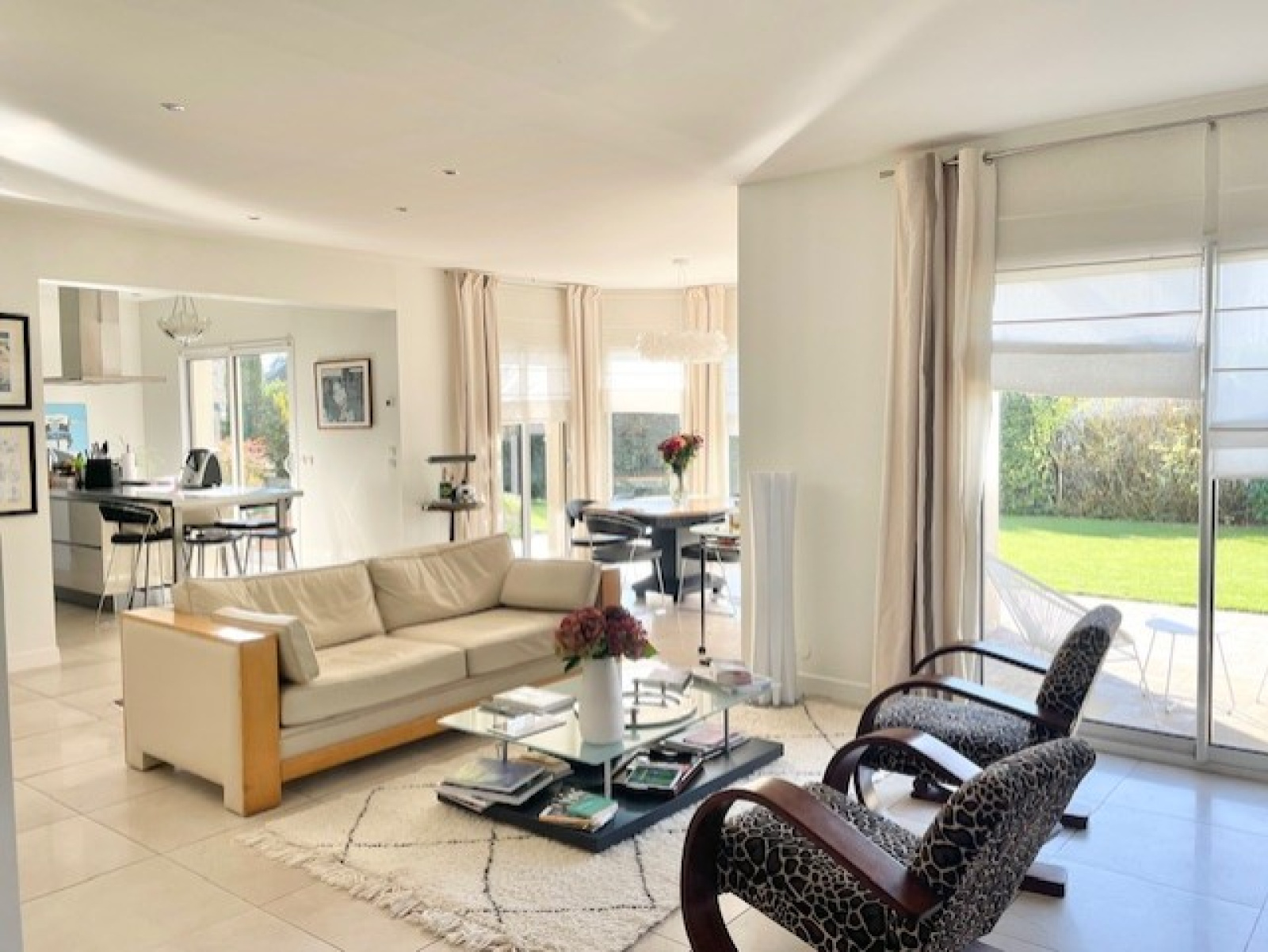 Cette maison contemporaine est édifiée sur un terrain plat et paysagé de 820 m² au calme. Elle propose une vaste entrée avec dressing, un espace de vie lumineux avec poêle à bois, une cuisine ouverte équipée avec îlot central et un accès sur une belle terrasse, une chambre avec salle de douche, un toilette, une buanderie. Espace studio avec un salon, une chambre, douche et toilettes. A l'étage, le palier dessert une suite parentale avec dressing, salle de bains balnéo, douche et toilette, deux chambres avec placards, une salle de bains/ douche, un toilette. Un home-cinéma en sous-sol, une cave à vins. Garage. Beau jardin. Proximité des commerces, écoles et collège.