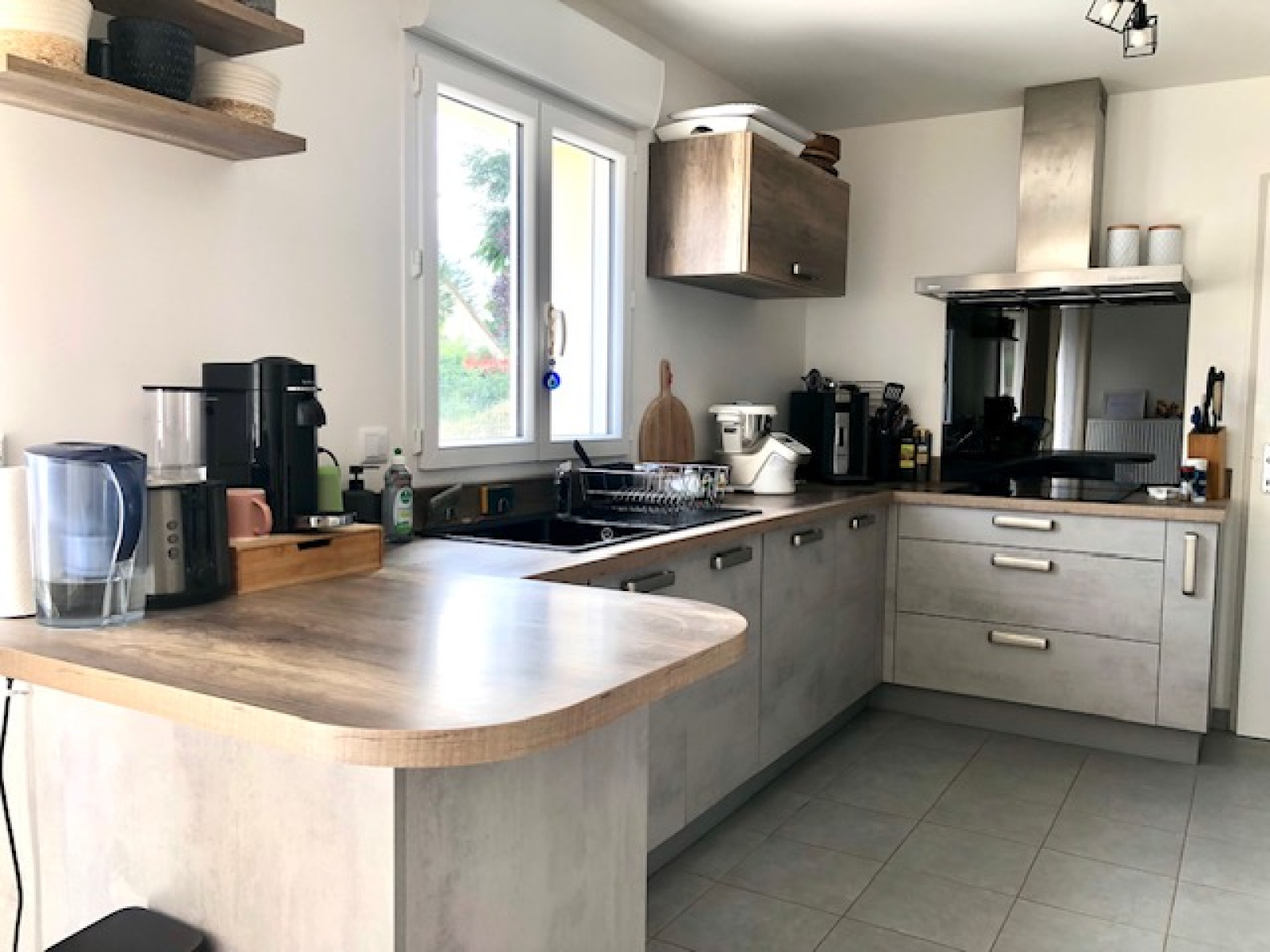 Située dans un cadre agréable et à proximité de la nature, cette maison contemporaine construite en 2020 selon les normes RT2012 saura vous séduire. Elle se présente ainsi : au rez-de-chaussée, une spacieuse pièce de vie baignée de lumière avec accès direct à la terrasse orientée plein Sud, cuisine moderne entièrement équipée, cellier et toilettes. A l'étage, une grande suite parentale avec salle de douche, trois chambres avec placards et une grande salle de bains/toilettes. Un garage avec porte motorisée. Le tout sur un terrain clos de 484 m² avec terrain de pétanque. Opportunité rare sur le secteur, à visiter sans tarder !