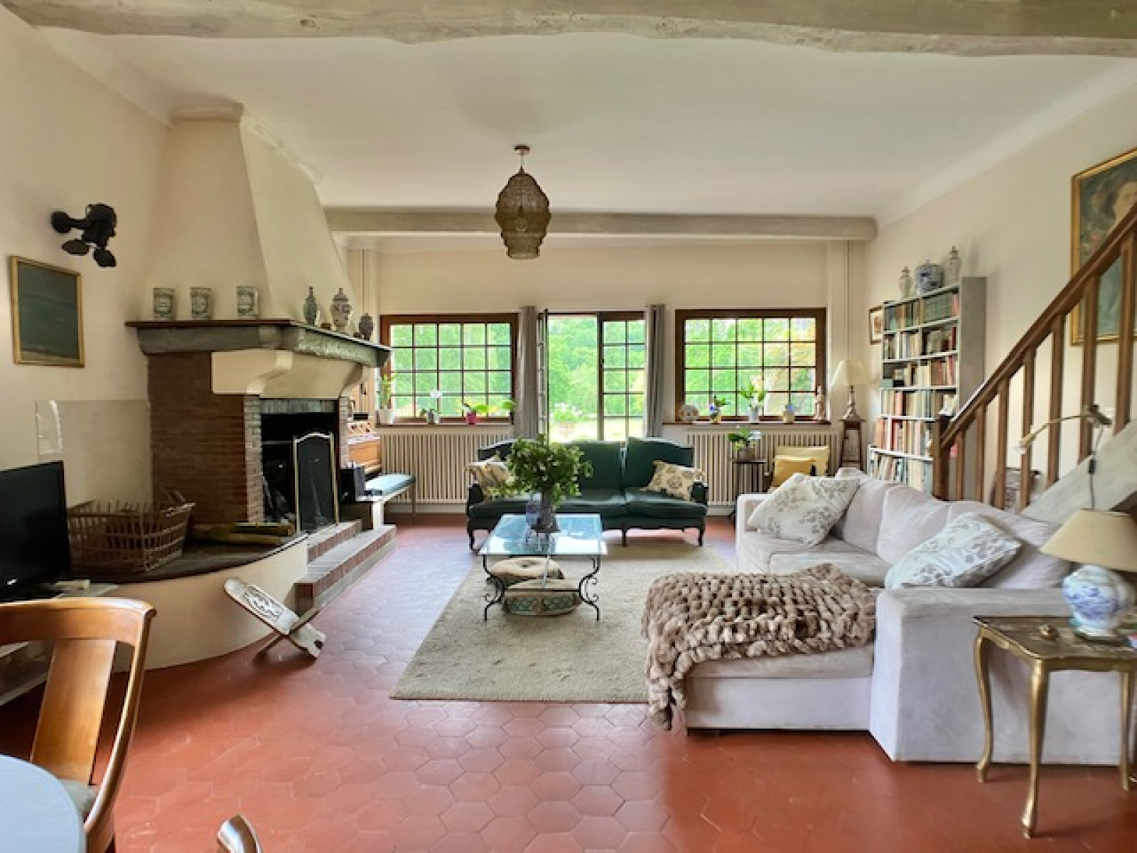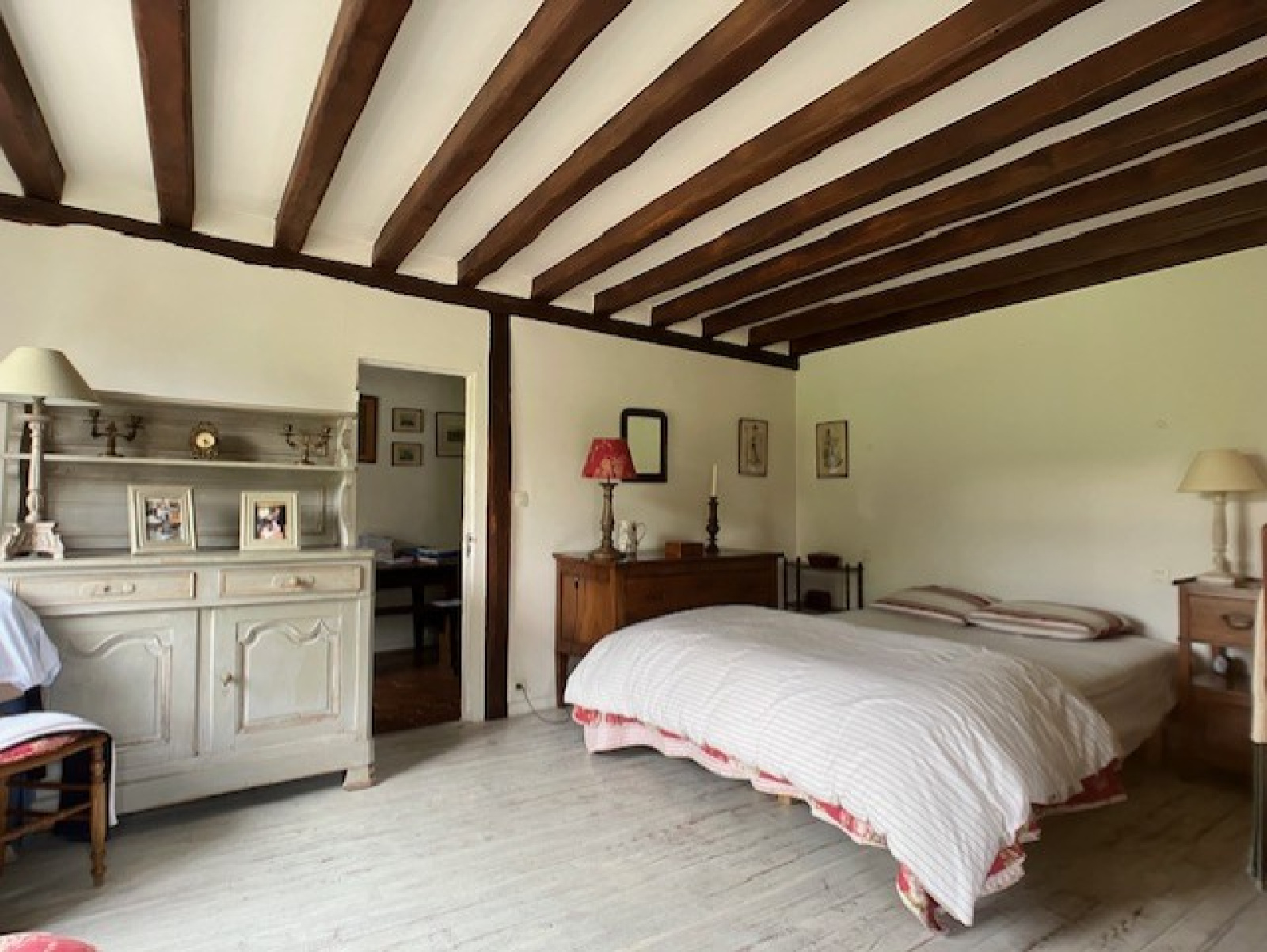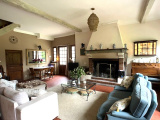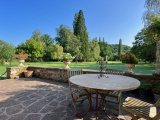 La bâtisse principale est composée d'un vaste séjour à la belle hauteur sous plafond donnant sur une terrasse en pierres. Celle-ci surplombe le terrain d'1,3 hectare dont la vue se prolonge sur les bois. La cuisine séparée dispose d'un accès à un autre jardin, plus intime et clos de murs. A l'étage, deux grandes chambres, un bureau et une salle d'eau. L'une des chambres, la plus grande, offre une vue spectaculaire sur le terrain et les alentours.
