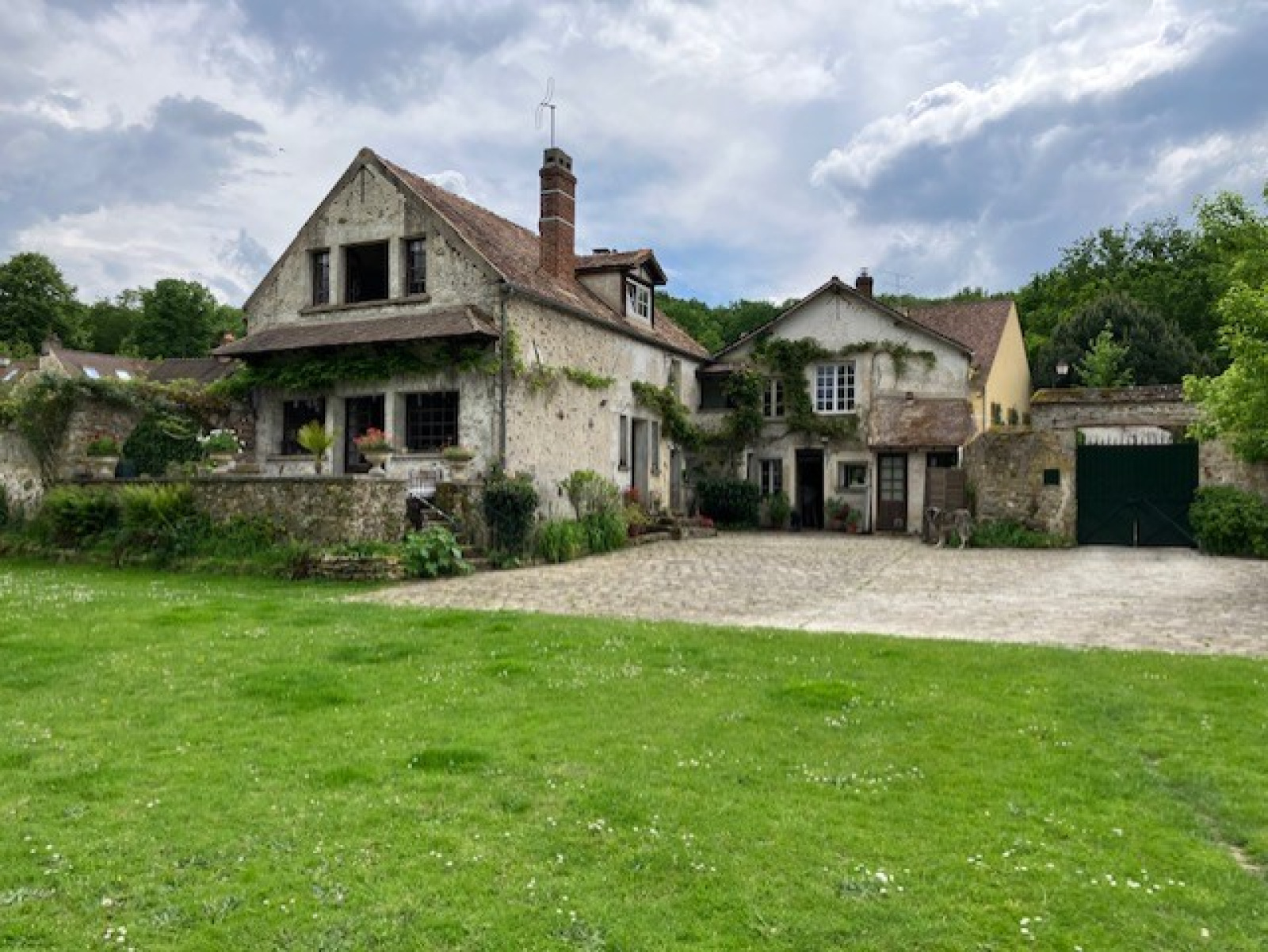 On accède à la propriété par un porche ouvrant sur une large cour pavée qui dessert trois habitations ainsi distribuées : deux bâtisses anciennes attenantes d'un côté et une maison plus récente, indépendante des premières, d'un autre côté.