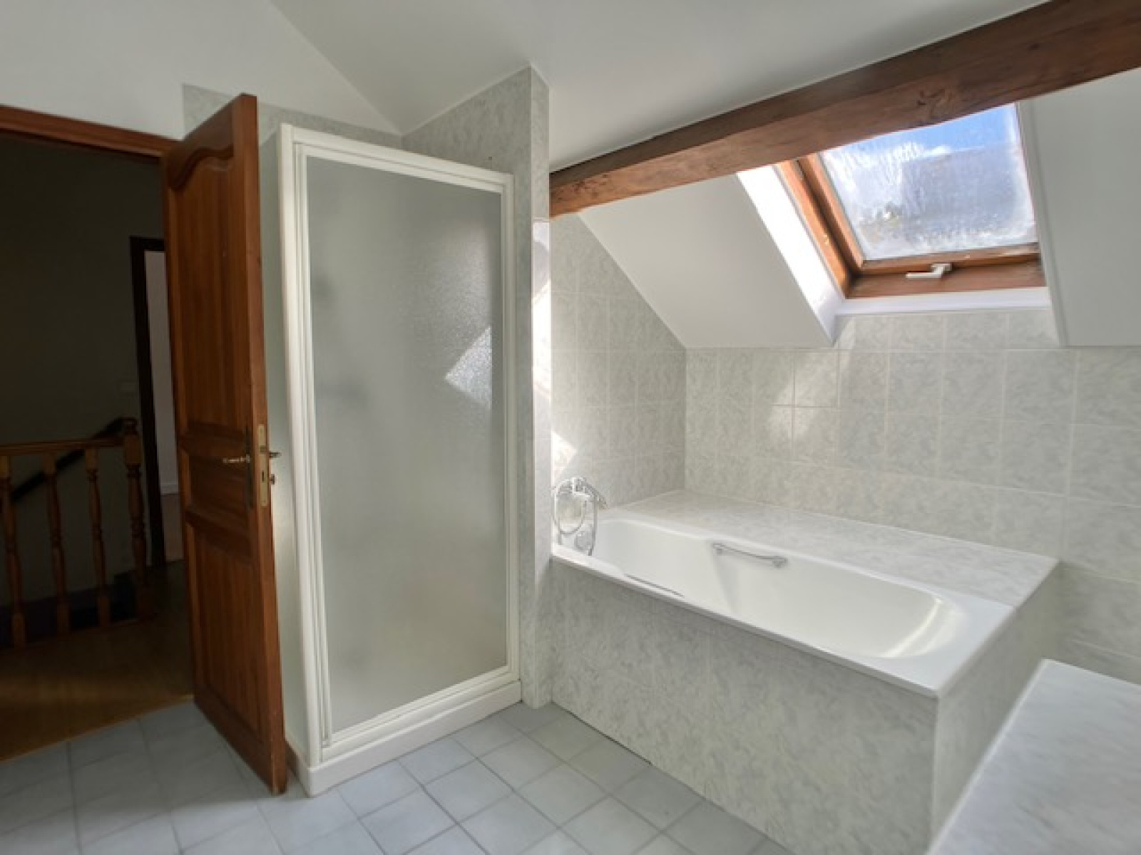 Elle offre un beau séjour de 32 m² avec cheminée et une baie vitrée donnant sur le jardin, cuisine séparée de 17 m², buanderie (7 m²) et garage (env. 20 m²). A l'étage, le palier dessert deux belles chambres, une salle de bains avec douche et des toilettes. Grenier non aménagé. Chauffage gaz de ville.